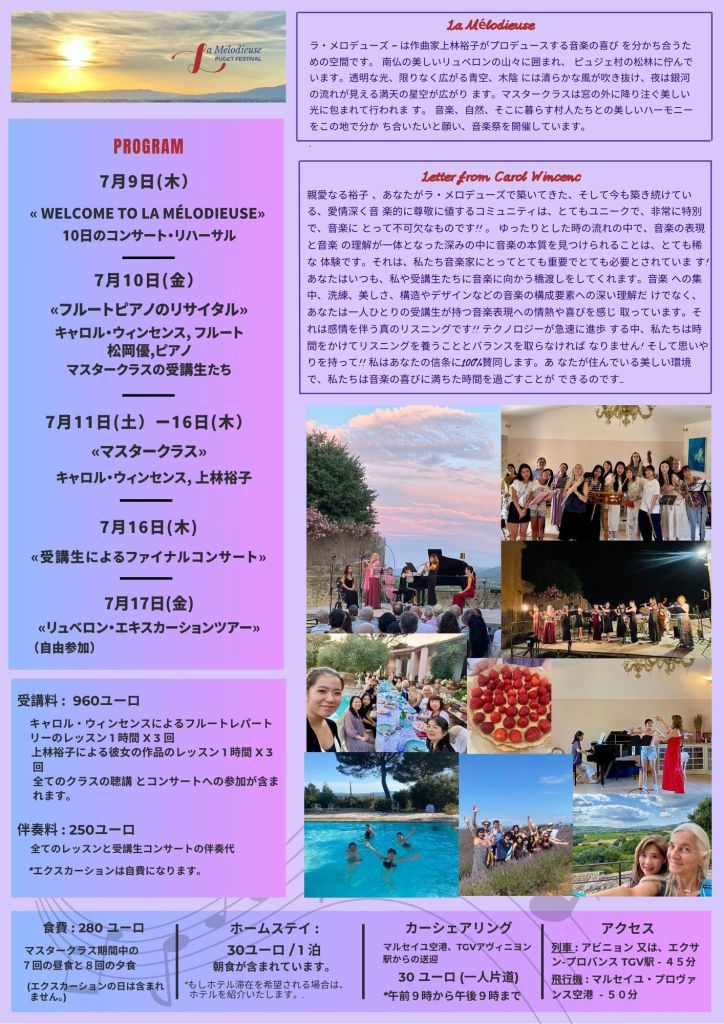 「リュベロンの澄んだ空気と美しい光の中で音楽の喜びを発見し、 世界中のミュージシャン、学生、村人、訪れる全ての人々とその喜 びを分かち合いたいと願っています」