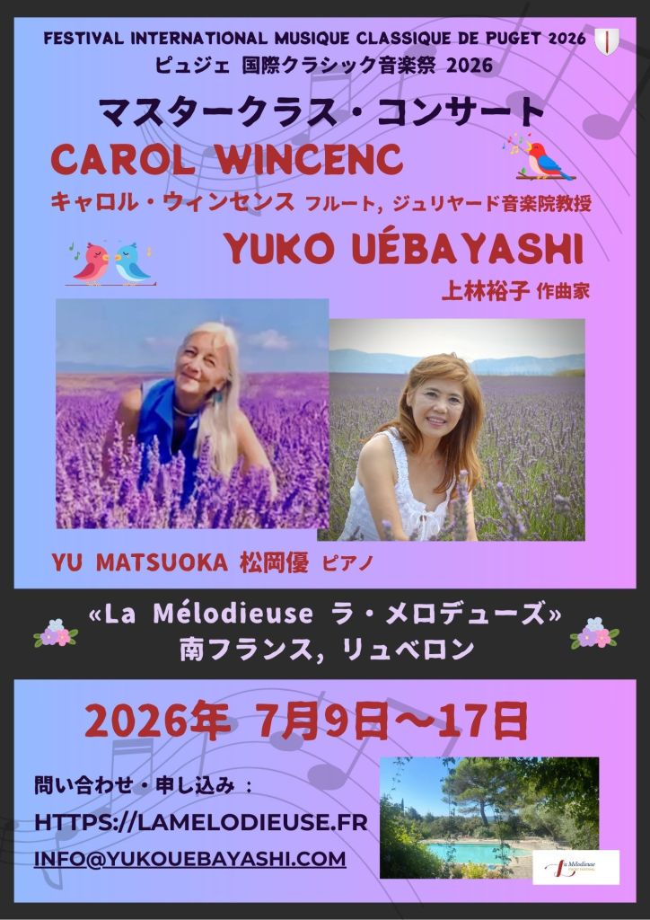 ~ ラ・メロデューズ ~ は作曲家上林裕子がプロデュースする音楽の喜び を分かち合うための空間です。 南仏の美しいリュベロンの山々に囲まれ、 ピュジェ村の松林に佇んでいます。透明な光、限りなく広がる青空、木陰 には清らかな風が吹き抜け、夜は銀河の流れが見える満天の星空が広がり ます。マスタークラスは窓の外に降り注ぐ美しい光に包まれて行われま す。