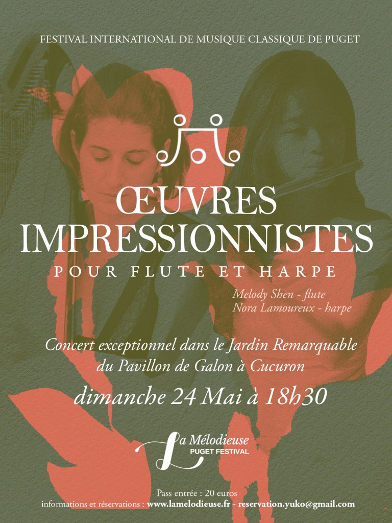 Concert “Harmonie avec Flûte, Harpe et Nature” – Melody SHEN et Nora LAMOUREUX – Dimanche 24 mai 18h30 à Pavillon de Galon Cucuron